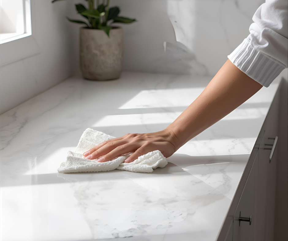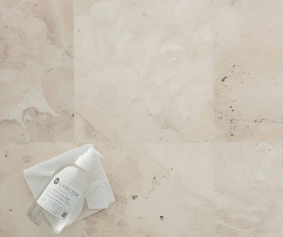 Use a pH-neutral stone cleaner (or mild dish soap). Never use cleaners with vinegar, bleach, lemon, ammonia, or abrasive scrubs.