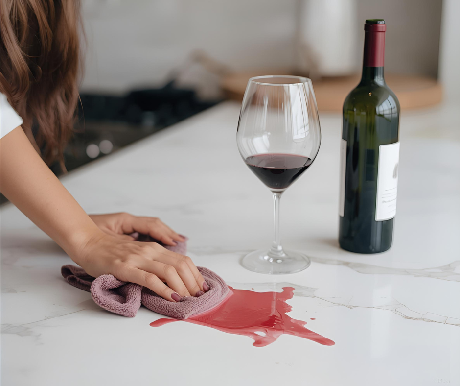 Acidic foods/drinks (tomato, citrus, wine, coffee, vinegar) can etch marble and dolomite — clean them up right away.